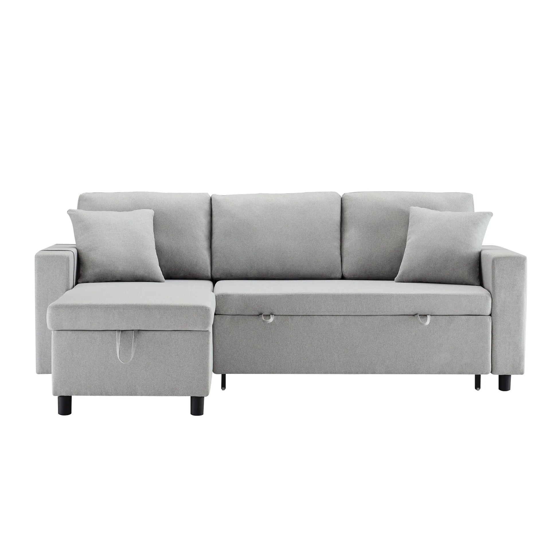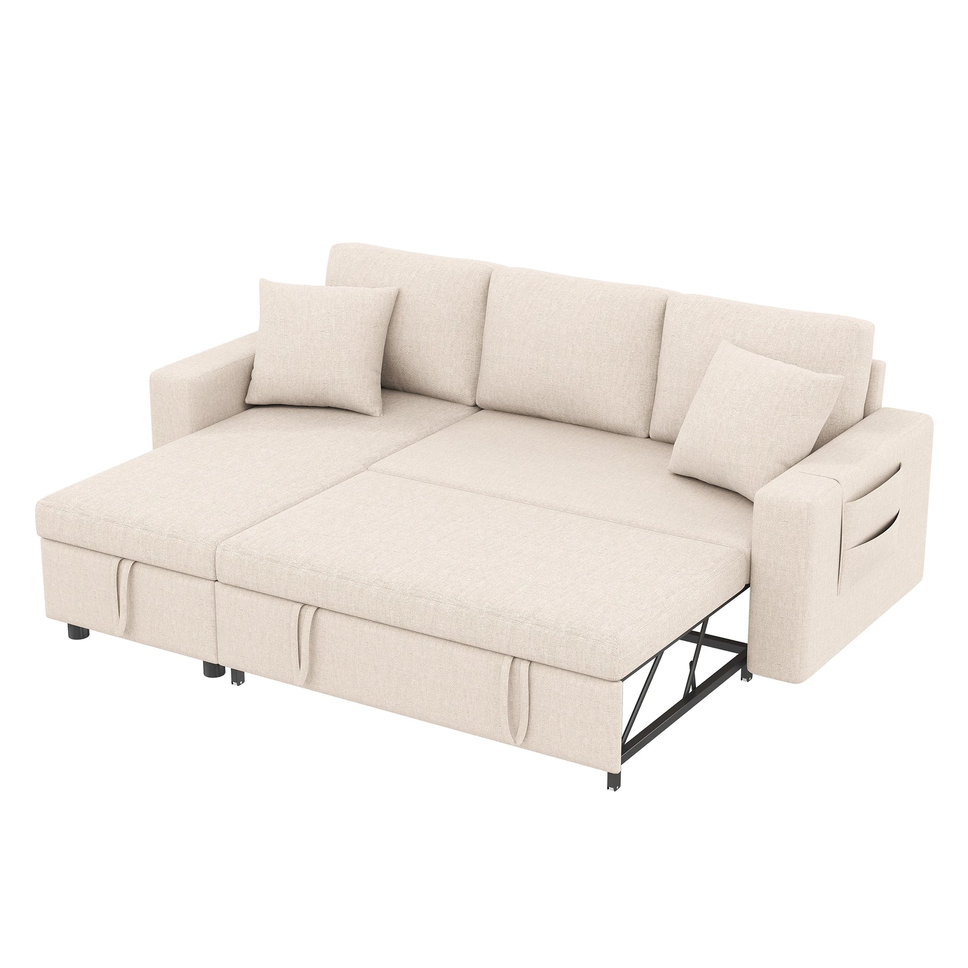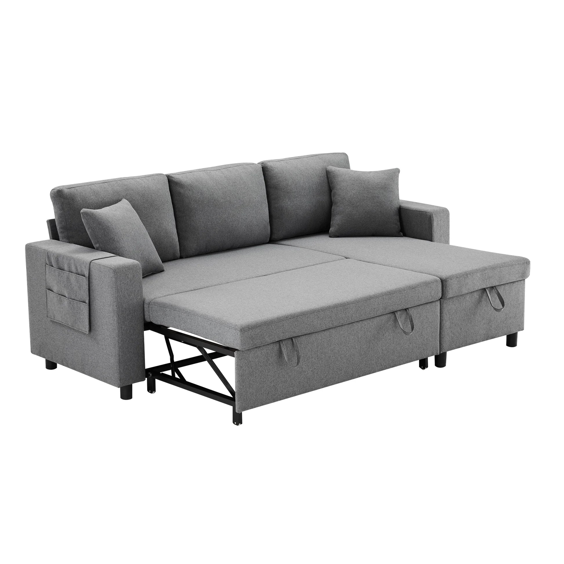 Une fois déplié, le canapé devient un lit généreux offrant un espace confortable pour le repos. Les deux oreillers inclus apportent un soutien supplémentaire, aussi bien en position assise qu’allongée.